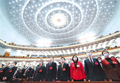 15时,全国政协十四届一次会议主席团会议主持人王沪宁宣布大会开幕。全体起立,高唱国歌。