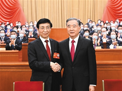3月10日,全国政协十四届一次会议在北京人民大会堂举行第三次全体会议。当会议主持人宣布王沪宁当选政协第十四届全国委员会主席后,汪洋起立祝贺,与王沪宁热烈握手。 新华社记者 李学仁 摄