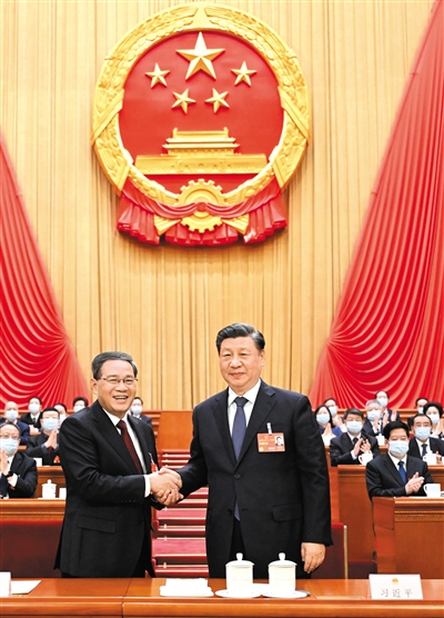 在主持人宣布李强同志为中华人民共和国国务院总理后,全场响起热烈的掌声,李强起身向代表们鞠躬致意。随后,他转向习近平,两人亲切握手,习近平向他表示祝贺。李强又同李克强同志握手,相互致意。