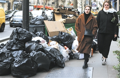 3月15日,人们走过法国巴黎街头无人清理的垃圾。巴黎市政府说,由于环卫工人持续罢工,截至15日,巴黎街头有76000吨垃圾待清理。 新华社记者 高静 摄