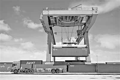 一辆货车在满洲里站货运车间集装箱场装卸集装箱(3月15日摄)。 满洲里口岸是中国最大的陆路口岸,也是中欧班列东通道进出境重要口岸。自1月8日满洲里公路口岸恢复客运通关以来,客流量呈稳步增长态势。铁路方面,年初至3月14日,经满洲里铁路口岸通行的中欧班列达924列97828标箱,较去年同期分别增长8.2%、19.8%,通关工作有序进行。新华社记者 贝赫 摄