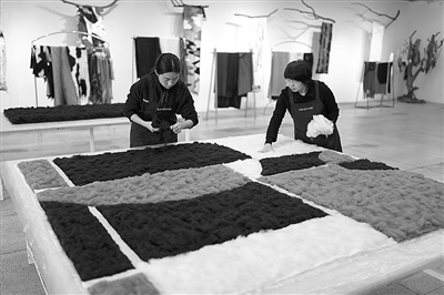 问起“回到源头”的工艺,最大的诀窍是什么?郭秀玲坦然地说,用手“慢慢地、耐心地拍”。在耐心拍的过程中,不同着色的羊绒,它们的细纤维彼此自然地“拍合”。艺术设计,不再是由流水线说一不二地完成,而是在人手与自然材质的“可能性”中呈现。所以,每一件制品,都是“这一个”,没有完全雷同的。
