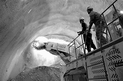 图为中铁四局施工人员在巢马城际铁路新大金山隧道进行贯通施工。
