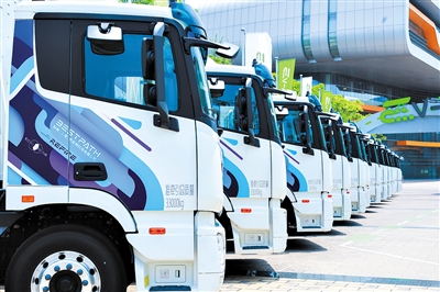 | 上海重塑能源集团与福田汽车合作投运的一批42吨氢燃料电池重卡。 资料照片 |