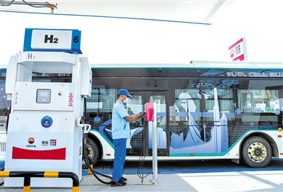 | 平霄路820号的油氢合建站工作人员正为氢燃料电池公交车加注氢气。 新华社记者 丁汀 摄 |