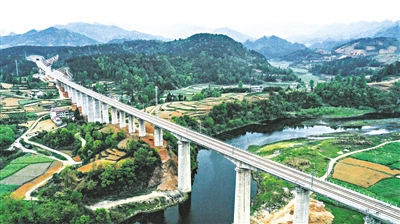 这是4月9日拍摄的贵南高铁贵州段三标营盘清水河双线特大桥(无人机照片)。 目前,由中铁三局等单位建设的贵(阳)南(宁)高铁建设进入冲刺阶段,工人们有序开展局部检测和施工,为年内通车奠定基础。 贵南高铁设计时速350公里,是我国“八纵八横”高速铁路网包头至海口通道的重要组成部分。 新华社记者 杨文斌 摄