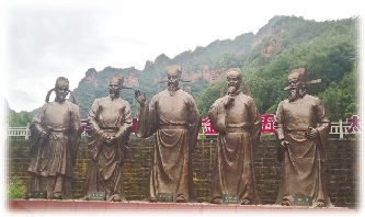 进了紫金山山门,雨刚好停了,我暗自庆幸,天公作美,好像下了这雨就是为了配合白云的升起。正冲着山门矗立着五座雕像,居中者即为刘秉忠,左右分别是张文谦、郭守敬、王恂、张易,五人皆曾在紫金山研读,后来成为国家栋梁,因此被称作“紫金山五杰”。其中郭守敬的名气最大,妇孺皆知,是中国古代最伟大的科学家之一,而他是刘秉忠的学生。