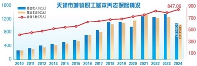 《白皮书》显示,就第一支柱而言,2024年,全市参保人数为1015.37万,全市基金收入1461.52亿元,基金累计结存812.23亿元。其中,截至2024年末,天津市城镇职工基本养老保险参保人数为847.06万,基金收入为1084.67亿元。