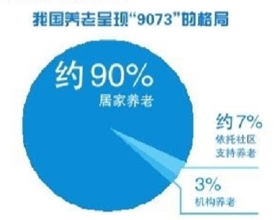 目前,我国养老呈现“9073”的格局,即约90%的老人居家养老、约7%的老人依托社区支持养老、3%的老人依托机构养老。