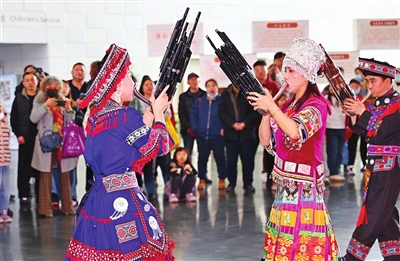 这场由天津歌舞剧院与天津图书馆联合打造的“艺书共享空间”专题活动,以“同心圆”为核心主题,既寓意家人相守团圆、民族同心同行,也让温暖情愫与向善能量在乐声中悄然传递。快闪现场,《同心圆》的婉转旋律与《白马》的灵动节奏交替奏响,四位笙演奏家阎艺、郭莉莎、曹家斌、王磊默契配合,指尖流转间,古老乐器的独特韵味在大厅中弥漫开来。不少读者循着乐声聚拢而来,有人迅速拿出手机定格这突如其来的美好,孩子随着节奏轻轻晃动身体,现场掌声与笑意交织。“过年期间,能在图书馆里听到多姿多彩的民乐,特别有年味,令人耳目一新。”大学生汪子涵欣喜地说:“书香与音乐的融合特别治愈,能让人在学习之余放松心情,真希望以后多些这样的活动。”