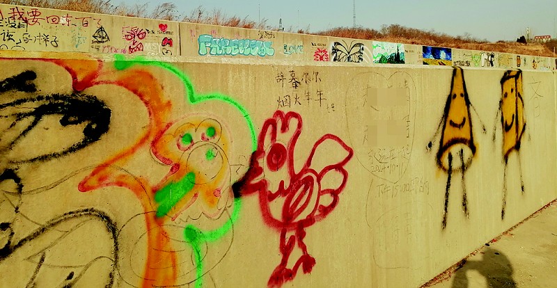 2月10日,记者到现场探访。在石槽浴场附近,大坝上布满了颜色各异的涂鸦。红色、白色、黑色……各种颜色交织在一起,显得有些杂乱无章。涂鸦内容繁杂多样,除了常见的一些“画作”外。杂乱错落地还写着大小不一的各种文字,有的是人名,如“柳某彤”“于某刚”等;有的则是游览打卡字样,如“战某荣到此一游”;也有示爱的,如“赵某婧和赵某君永远在一起”;此外,还有一些不文明的情绪表达。