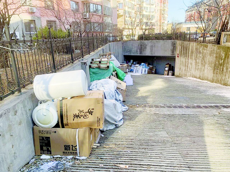 12日下午,记者来到了恒祥园小区。记者看到,位于25号楼北侧的地下设施通道上,张贴着人防工程的标识牌。人防工程的两个出入口,都被卷帘门封闭了;出入口前的通道上堆放了大量物品,包括热水器、油烟机等家电产品,以及一些纸壳箱子和杂物。这些堆放的物品将一侧的出入口堵塞得严严实实,另一侧出入口也被堵住了部分。