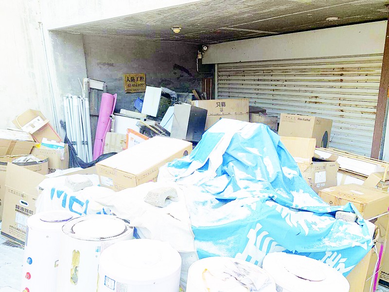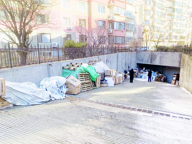 12日下午,记者来到了恒祥园小区。记者看到,位于25号楼北侧的地下设施通道上,张贴着人防工程的标识牌。人防工程的两个出入口,都被卷帘门封闭了;出入口前的通道上堆放了大量物品,包括热水器、油烟机等家电产品,以及一些纸壳箱子和杂物。这些堆放的物品将一侧的出入口堵塞得严严实实,另一侧出入口也被堵住了部分。