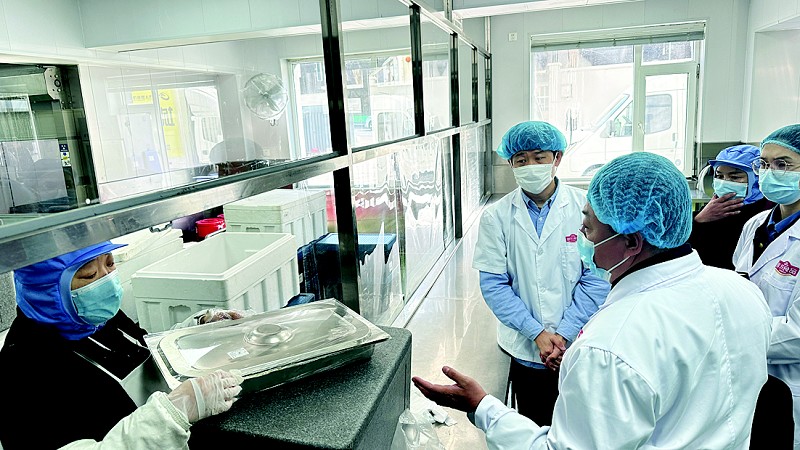 在位于高新区的集体配餐单位——大连信东食品有限公司后厨,检查组实地查看其配餐准备工作。