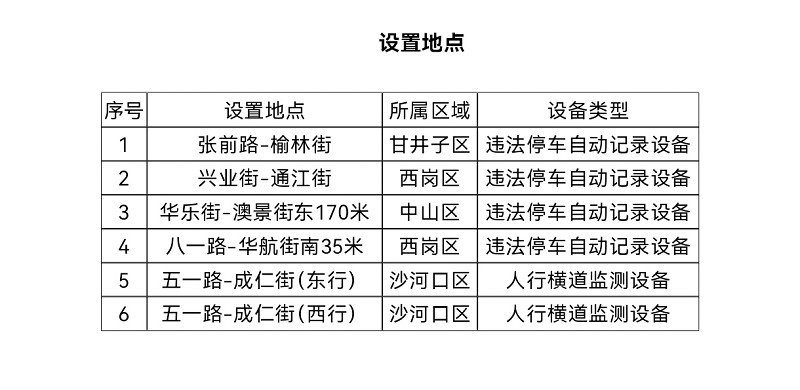 晨报讯(半岛晨报、39度视频记者岳宇艳) 根据道路交通安全管理需要,大连公安交警支队拟在以下道路设置六处交通技术监控设备,并于3月13日起对这些路段的交通违法行为进行记录。