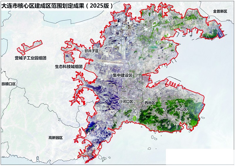 根据《通知》,我市核心区建成区总面积327.41平方公里。包括1个集中建成区和2个外围独立组团。其中,集中建成区包括从大连湾-后盐-前关-棋盘-范家-革镇堡-辛寨子-棠梨沟-柳树-庙岭-蔡大岭-小平岛一线至东南黄海沿岸,共321.98平方公里。外围独立组团2处共5.43平方公里。其中生态科技城组团2.40平方公里、营城子工业园组团3.03平方公里。均位于甘井子区。
