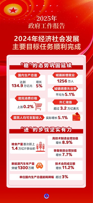国务院总理李强5日在政府工作报告中指出,过去一年,我国发展历程很不平凡。党的二十届三中全会胜利召开,对进一步全面深化改革、推进中国式现代化作出部署。我们隆重庆祝中华人民共和国成立75周年,极大激发了全国各族人民的爱国热情和奋斗精神。一年来,面对外部压力加大、内部困难增多的复杂严峻形势,在以习近平同志为核心的党中央坚强领导下,全国各族人民砥砺奋进、攻坚克难,经济运行总体平稳、稳中有进,全年经济社会发展主要目标任务顺利完成,高质量发展扎实推进,新质生产力稳步发展,我国经济实力、科技实力、综合国力持续增强,中国式现代化迈出新的坚实步伐,更加坚定了我们在新时代新征程全面建设社会主义现代化国家的决心和信心。