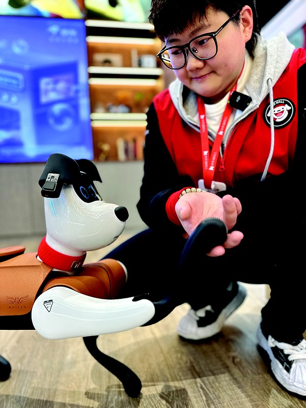 这只AI智能狗名叫小白,拥有能显示表情的面部屏幕和较为灵活的金属四肢,还有接近五六岁孩子的说话声音。工作人员问它:“今天是不是3月5日?”它说:“是的。”工作人员又问它:“如果今天去约会喝咖啡应该穿什么衣服?”它回答:“那得看你今天的心情,还要看和谁一起喝咖啡。”工作人员摸摸它的头,它的面部屏幕上刚刚还圆睁的眼睛立刻弯成了弦月,脸蛋还浮现出一对粉红的大圆点。