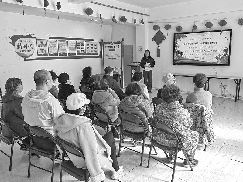 晨报讯(陈舫玥 半岛晨报、39度视频记者王钟俊) 近日,白云街道民运社区邀请辖区律师事务所的律师开展了一场以“社区普法正当时,共筑钱袋安全网”为主题的“3·15”普法宣传活动。