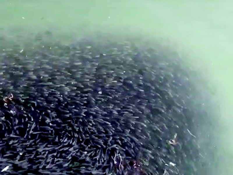 大群梭鱼聚集染黑海面