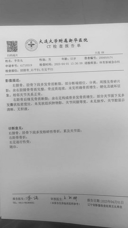 本是兴冲冲地去给儿子选购婚房,不料看房时从楼梯摔下,腿部粉碎性骨折……4月1日,在甘井子区大连湾碧海新苑一处带下跃户型的售楼现场,市民李先生下楼梯时不幸坠入地下室。“地下室里比较黑,木板楼梯又窄又陡,还没有扶手……”李先生认为是售楼处安全保障工作不到位致其摔伤。对此,售楼处另有一番说法。具体情况如何?记者进行了调查采访。 看房客户: 本想抓扶手,结果坠下楼 4月1日11时许,李先生在房产中介的带领下,来到了位于甘井子区大连湾的碧海新苑为儿子选购婚房。在楼盘售楼处了解基本情况后,李先生跟着售楼处安排的销售人员,前往建筑一层带下跃的户型实地看房。 “看完一层的房间后,我合计再去下跃的房间看看,没想到就出事了……”李先生告诉记者,看的房子是清水的,地面有个楼梯口,需下楼梯进入下跃房间。李先生记得,售楼处的销售人员在他前边走,下楼前曾叮嘱他“慢点,慢点”。不过,他没想到下跃房间内没有窗户,也没有灯光。当李先生下到第三级阶梯时,视线突然从明亮环境陷入黑暗,他慌乱之下差点踩空。下到第四级阶梯时,李先生感觉重心失稳,他伸出手想去抓楼梯的扶手,但没想到楼梯没有扶手,结果直接坠楼摔伤。 4月3日,记者在医院见到了李先生。记者看到,他的右脚踝上下有严重的肿胀,脚底有少许血渍。医院CT检查报告单显示,其右腓骨、胫骨下段多发粉碎性骨折,右距骨也有骨折的情形。李先生表示,接下来他要进行两次手术,恢复期可能要一年左右,医疗费用预计需五六万元。 摔下楼梯后,李先生在救援人员提供的光照下才看清楼梯的模样。“楼梯非常简陋,阶梯是简易木板搭建的,又窄又陡,还没有扶手。”李先生表示,在他下楼前,销售人员未提示楼梯没有扶手的情况。因此,他认为,其摔伤与售楼处安全保障工作不到位有直接关系。“但到现在,售楼处没有联系慰问,也没有任何说法。”李先生在接受采访时说道。 房产中介:刚想打开手电筒照亮,人就摔下去了 情况是否如李先生所说?3日,记者根据李先生提供的信息,找到了带他去碧海新苑楼盘看房的房产中介。 1日当天,陪同李先生前往售楼现场的是一男一女两名中介人员,提起李先生坠楼一事,他们仍是心有余悸。“当时为了保护李先生,售楼处销售人员走在前边,我跟在李先生后面。”中介人员马女士表示,销售人员下楼前曾提示李先生“要慢点”,李先生也回复了“好的”。然而,正当她准备打开手机的手电筒时,就听见李先生“嗷”的一声摔下去了。意识到出事了的马女士,赶紧贴着墙边下楼梯查看情况。“当时李先生躺在地上,直喊腿疼,动不了了。”马女士说,销售人员去打120急救电话的同时,她留在地下室安慰李先生。这时她才看到楼梯确实又高又陡没有扶手,地下室里也没有出口和窗户。 男性中介人员是这家房产中介公司的负责人,他没有跟下楼。他告诉记者,事发的楼梯口大概两三平方米大小,楼梯是木板临时搭建的,阶梯宽度约1米。120急救人员到场后,为避免给李先生造成二次伤害,没有贸然挪动李先生。之后,售楼处销售人员接连拨打了110和119。“最终是119专业救援人员用升降梯将李先生拽上来的。”男性中介人员说。 事发后,这家房产中介公司决定,这类带下跃或上跃的户型,如果楼梯不扎实,没有扶手护栏等,他们不会再带消费者去实地看房了。 售楼处:已将引导提示工作做到位 3日11时许,记者来到了碧海新苑售楼处。面对记者来访,售楼处一名工作人员表示有急事需外出,她留下联系电话要求稍后沟通。记者提出想去李先生坠落的房子看一看,她表示,所有带下跃户型的钥匙都被开发商收走了,“因为出事了嘛,下跃的房子先不卖了。” 下午,记者电话采访了这名工作人员。她表示,当时她不在现场,对事情的具体经过不太了解。她告诉记者,该楼盘下跃的地下室确实比较黑。当时,销售人员领着李先生下楼时,嘱咐过李先生“要慢一点,小心一点,楼梯比较黑。”有销售人员告诉她,应该是楼梯比较滑,“客户慌张了,在还差几级阶梯时,自己蹦下去了。”“可能是客户体重基数比较大,脚脖子杵着了。”她表示,其公司的销售人员把该做的服务都做了,引导提示等工作也做到位了。“这个产品销售近一年了,其他客户都没有发生类似的情况。”她说。 ■最新进展 记者了解到,李先生已委托律师介入,将通过法律途径维护其正当权益。对此,碧海新苑售楼处工作人员表示,不太清楚公司将如何处理,她已将情况汇报给相关负责人。事情会如何发展?本报将持续关注。 本报特别报道组文/图