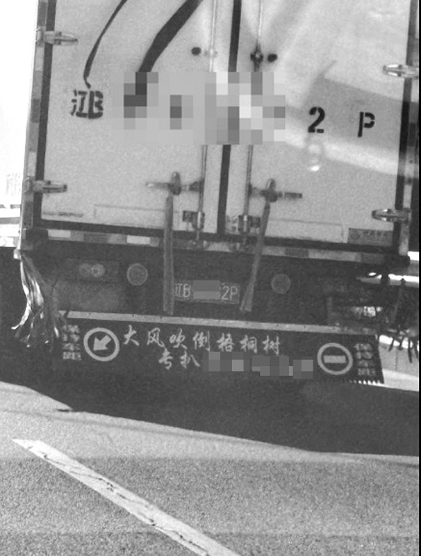 4月2日上午11时许,张女士驾车由振兴路上了东北快速路,她刚一上东北快速路,目光立即被前方的一辆辽B牌照的货车吸引。因为这辆货车的尾部有一块悬挂物,上面写着“大风吹倒梧桐树 专扒×××××”等不雅字样。