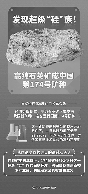 新一轮找矿突破又传好消息。自然资源部10日发布公告:经国务院批准,高纯石英矿正式成为我国新矿种,这也是我国第174号矿种。
