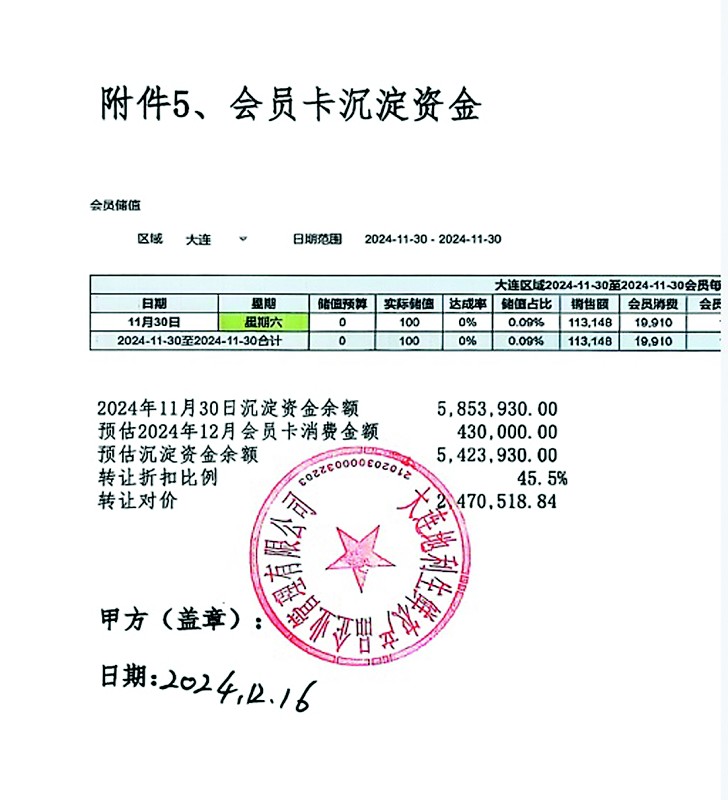 记者注意到,协议中附件5为会员卡沉淀资金,内容为2024年11月30日沉淀资金余额为580万余元,预估2024年12月会员卡消费金额为43万元,预估沉淀资金余额540万余元。