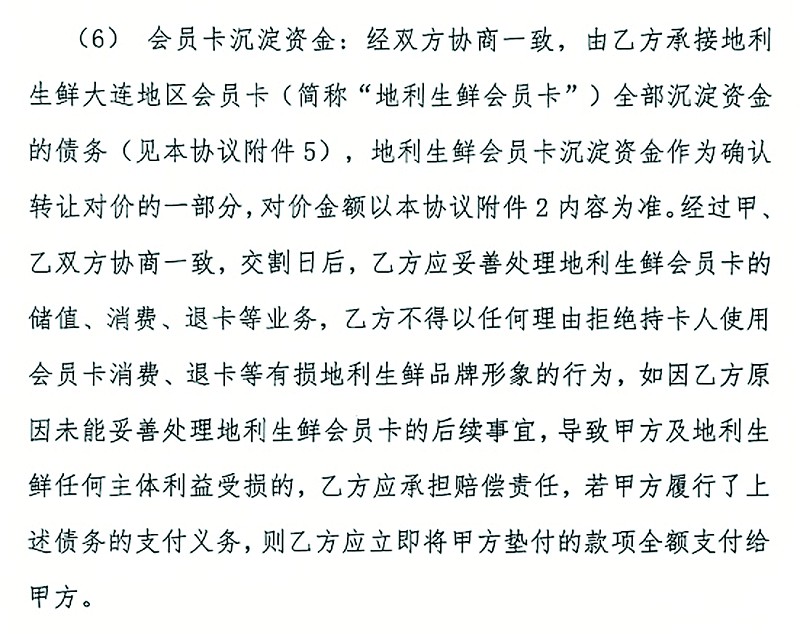 协议中对于会员卡沉淀资金约定内容为:经双方协商一致,由赢嘉生鲜承接地利生鲜大连地区会员卡全部沉淀资金的债务……交割日后,赢嘉生鲜应妥善处理地利生鲜会员卡的储值、消费、退卡等业务。