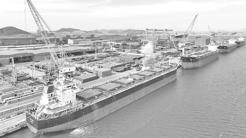 目前,3号舾装码头30.6万吨VLCC首制船已进入试航前最后冲刺阶段;1号船台181000载重吨散货船首制船主船体成型;1号船坞新建1000吨龙门吊正全力冲刺竣工验收目标;在发动机总装车间,6台船用发动机紧密排列,同步装配,一批批成品发动机整装待发……恒力重工各生产板块和业务单元协同发力、齐头并进。