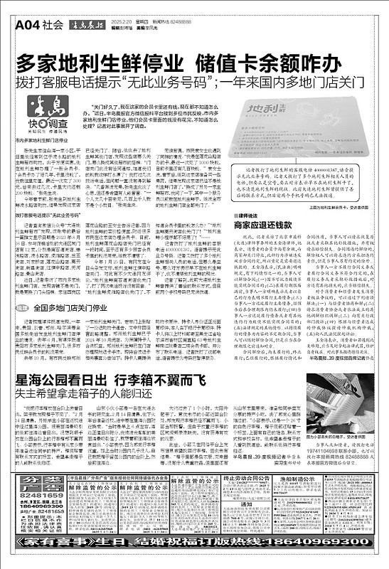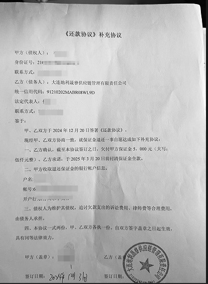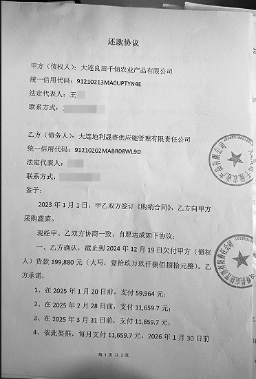 大连市内多家地利生鲜门店停业,很多消费者会员卡里的余额没有消费完,预估余额超过500万元。本报对此事进行报道后,有多名曾经给地利生鲜供应果蔬、肉类的供应商反映,地利生鲜方面拖欠他们货款。初步统计,地利生鲜拖欠45家供应商保证金、货款总额高达628万余元。对此地利生鲜方面表示“目前无力偿还”。 供应商与地利生鲜采用先供货后付款合作模式 并缴纳5000元保证金初期顺利,后期出现拖延付款情况 “从签订协议到现在,对方连一笔款项都没有支付过。” ——李先生 地利生鲜拖欠夫妻档供应商33万货款 李先生和王女士夫妻俩在甘井子区南关岭太子桥附近的大连果菜批发市场,从事蔬菜批发生意已有多年。大约五年前,他们开始与地利生鲜方面建立合作关系,为其供应新鲜蔬菜。“我们采用的是先供货后付款的合作模式,最初还缴纳了5000元保证金。”李先生回忆道。 在合作初期,双方交易顺畅,按照约定流程,夫妻俩送货后,地利生鲜通常会在一个月内完成货款结算。然而,这种良好的合作态势在去年下半年发生了转变。李先生表示:“从去年下半年开始,地利生鲜方面就开始出现拖延付款的情况,结算周期变得越来越长。” 李先生介绍,截至去年10月最后一次供货时,地利生鲜方面已累计拖欠他们货款达13万余元。“实际上,拖欠金额远不止这些。”李先生补充道,“因为我们夫妻各自名下都注册了公司,我妻子王女士名下的大连良田千倾农业产品有限公司也被拖欠了近20万元,两家公司合计被拖欠总额超过33万元,另外还有保证金没有返还。” 签订还款协议后,还款承诺全落空 面对日益严重的拖欠问题,李先生夫妇多次与地利生鲜方面进行交涉,但对方总是以“资金周转困难”等各种理由推诿拖延。在持续追讨下,去年12月中下旬,地利生鲜方面终于与两家公司分别签订了书面还款协议。 记者获得的还款协议显示,王女士公司的协议明确约定:截至2024年12月19日,大连地利晟睿供应链管理有限责任公司(地利生鲜子公司,下称地利晟睿)欠大连良田千倾农业产品有限公司19.9万余元。还款计划具体为:2025年1月20日前支付5.99万余元首期款;自2025年2月起,每月月底前支付1.16万余元,直至2026年1月30日前付清全款。 协议中还特别约定了违约责任条款:若地利晟睿任意一期款项逾期支付,债权人有权要求对方立即清偿全部剩余欠款;逾期付款的,应按剩余款项的日万分之三支付违约金;同时,债权人因追讨欠款产生的诉讼费、律师费等合理费用也由违约方承担。 然而,让李先生夫妇深感失望的是,尽管白纸黑字签订了还款协议,地利晟睿却始终未能履行任何付款义务。“从签订协议到现在,对方连一笔款项都没有支付过。”李先生无奈地说。更令他们震惊的是,他们发现地利晟睿办公场所已大门紧锁,人去楼空。“无论是通过电话联系还是上门催讨,我们都找不到任何负责人。” 目前,李先生夫妇正在积极收集证据,准备通过法律途径维护自身权益。 “协议成了一纸空文,我们被彻底忽悠了。” ——孙先生 遭拖欠87万,签还款协议后分文未付 记者了解到,与李先生、王女士夫妻俩有相同遭遇的供应商不在少数,他们都遭遇了地利生鲜方面拖欠货款的问题,涉及金额从几万元到数十万元不等。孙先生是西岗区大菜市的一名蔬菜批发商,大约三年前开始为地利生鲜供货,当时他同样缴纳了5000元保证金。 孙先生反映,从去年下半年开始,地利生鲜方面就出现了货款结算滞后的情况。“起初只是延迟几天,后来拖欠时间越来越长。”孙先生告诉记者,尽管他多次前往公司催要货款,但对方总是以各种理由推脱。截至去年年底,地利生鲜方面拖欠孙先生的货款累计已达87万余元,此外还有5000元保证金没有返还。 去年12月中下旬,在孙先生等供应商的强烈要求下,地利晟睿与供应商们签订了书面还款协议。然而协议签订后,公司并未按照约定履行还款义务。“协议成了一纸空文,我们被彻底忽悠了。”孙先生无奈地说。 45家供应商组群欠款统计超628万 目前,遭拖欠货款的供应商已自发组建微信维权群,截至记者发稿时,已有45家供应商加入。据群内初步统计,地利生鲜方面拖欠这45名供应商的货款及保证金总额高达628万余元。记者获得的统计表显示,单个供应商被拖欠金额从最低的5000元保证金,到最高的七八十万元不等,其中超过50万元的大额欠款就有多笔。一位供货商表示,地利生鲜方面拖欠货款,不仅影响了他们的正常经营,更让众多中小供应商面临严重的资金压力。 “这还只是我们目前能联系到的部分供应商,”李先生透露,“实际上受影响的供应商人数和拖欠总金额要远高于现在的统计数字。”面对长期拖欠,部分供应商已采取法律手段维权。 地利生鲜方面表示“目前无力偿还” 4月15日,记者联系了大连地利生鲜农产品企业管理有限公司(下称“大连地利生鲜”)相关负责人。对方表示,地利晟睿作为大连地利生鲜的子公司,确实存在拖欠众多果蔬、肉类等供应商货款的情况。 “具体涉及多少供应商、拖欠金额有多少,我这边没有详细数据。当初签订还款协议后,公司收走了所有相关材料。”该负责人称,自己曾就还款协议事宜向公司反映,但“得到的答复是公司目前无力偿还,正在筹措资金,供应商可以通过法律途径解决”。 ■律师说法 协商不成可诉讼 北京市盈科(大连)律师