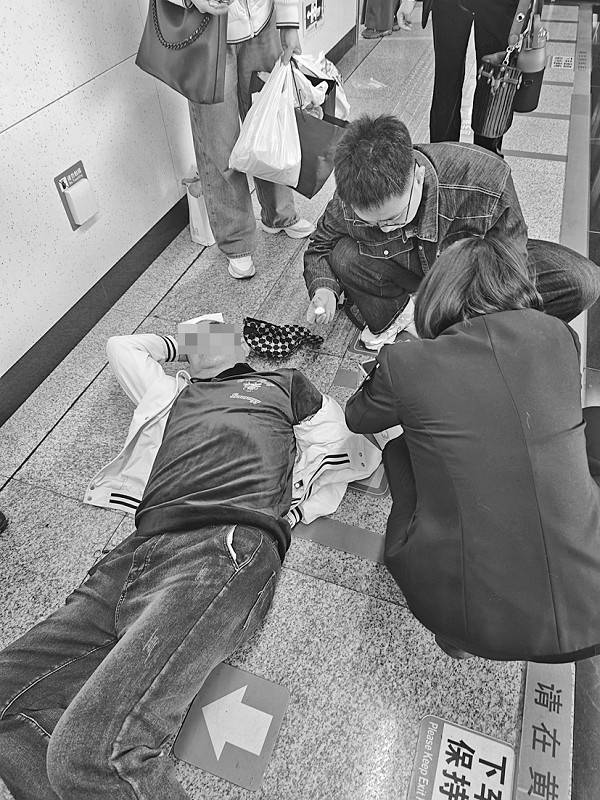 “男厕门口有人倒地了!”4月20日下午4点30分左右,地铁1号线华南广场站的工作人员陈燕接到了一条消息。随后,她以最快的速度跑向卫生间。在男厕门口,陈燕看到一名男子躺在厕所门口的盲道上,用纸巾捂着后脑勺。