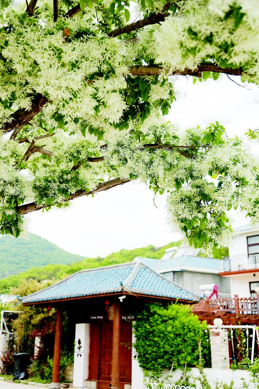 大连西郊韩家屯的这棵古老的流苏树,此刻静静绽放,与蓝天白云、绿水青山相映成画。