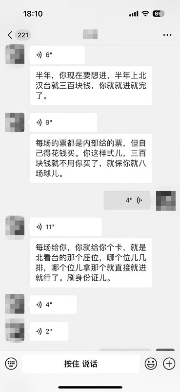 市民连先生是一名足球爱好者,比较喜欢前往足球场现场看球,感受氛围。今年6月24日,一名此前并不常联系的微信好友突然主动找到了连先生,聊起了有关足球的话题。“聊到了今年的中超联赛时,对方得知我会前往大连梭鱼湾足球场看球后,表示可以提供‘内部’票,又便宜位置又好。”连先生表示,对方提出可以以300元的价格,卖出6月30日当天及以后共8场大连英博队在大连梭鱼湾足球场的主场球赛球票,观赛位置在足球场北看台。
