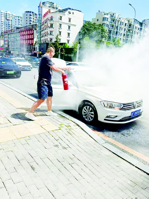 据成都车游天下网络科技有限公司大连分公司总经理周华永介绍,公司办公地距事发地仅20米。看到两位女士慌张敲门,他立即开门询问情况。“出门一看,车冒出的烟已很大了,我赶紧让她们进屋接水。”周华永回忆道。到达车旁后,发现仅靠一桶桶水往上浇很难扑灭火情,“当时,车辆前中网和防火墙周围已出现明火,且周围停放的车辆较多。”情况紧急,周华永迅速调动店内3名女员工,有人联系车主挪车,有人到旁边商铺借灭火器,有人接水,他则用店里和借来的灭火器对准明火反复喷射,这其间,员工协助车主拨打了119。