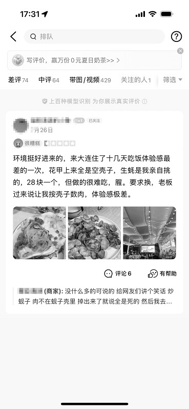 面对质疑,餐厅的负责人解释称,高温爆炒工艺会导致蚬肉脱壳,属于正常现象,与蚬子新鲜度无关。但女子拒绝接受该解释,当场拍照留存证据,并在未离开餐厅时,便通过电商平台发布低星差评。