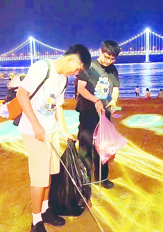 到了晚上,城市灯光渐次亮起,大多游客已返回酒店休息,而“夜不归宿”的李彦达和黄智浩又转战至星海广场的海边沙滩,继续忙碌。夜晚的海风带着凉意,他们的热情却并未消减。借助路灯的光亮,他们清理着遗留在沙滩上的各种垃圾,通常要一直忙碌到晚上九十点钟。