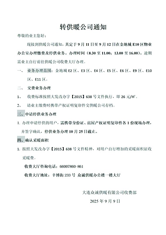 市民刘女士居住在甘井子区金地城小区。9月9日,她收到小区管家发来的供暖收费通知。