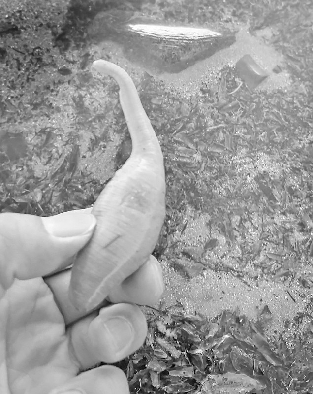 周先生描述称,这个生物的身体质地柔软,没有外壳,但又不似海肠那般绵软;它拥有类似蛏子的管状构造,却不见丝毫硬壳的踪迹。它在他手中始终一动不动,没有任何气味,颜色也未见变化。“我沿着海边走了两三百米,只发现了这一个,很特别。”周先生说。