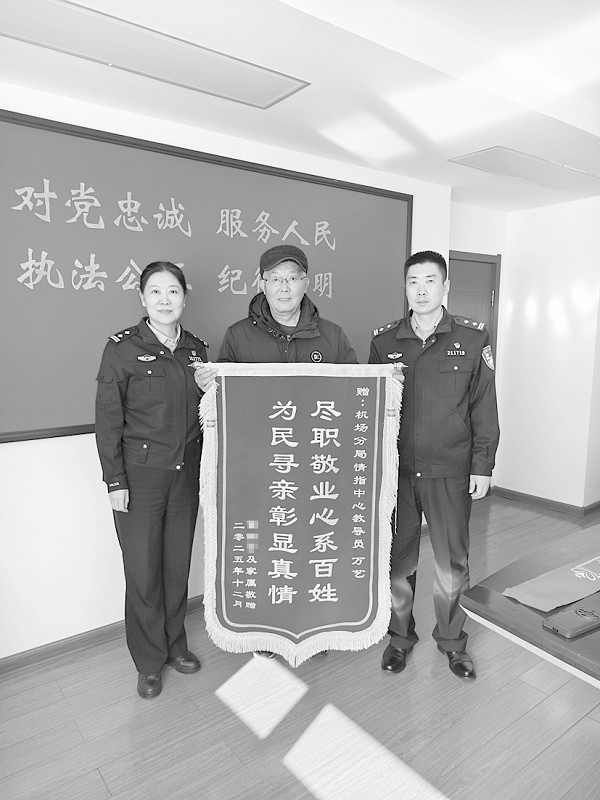 晨报讯(白雁行 半岛晨报、39度视频首席记者黄凤桐) 12月24日上午,市民葛先生来到大连市公安局机场分局,将一面写有“尽职敬业心系百姓 为民寻亲彰显真情”的锦旗送到民警手中,感谢民警帮他找回了走失多日的妹妹。