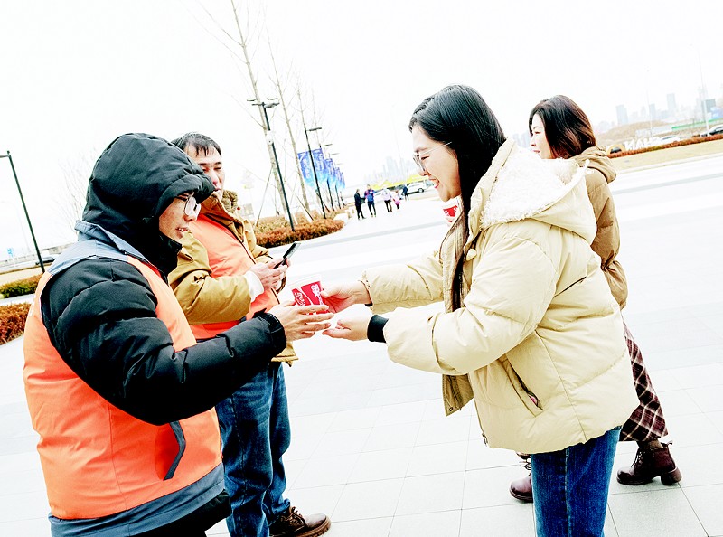 这份冬日的温暖并未止步于市集内部,作为“‘可’爱辽宁 暖在一起”系列公益行动的重要一环,志愿者们主动走向商场周边的环卫工人与忙碌奔波的外卖员,为他们送上一杯杯热气腾腾的姜汁可乐,并送上最真挚的感恩:“献给城市里默默无闻的劳动者”“平凡的日子,送您一杯不平凡的温暖”……接过热饮的户外工作者们脸上绽开的笑容,与杯中升腾的热气,共同构成了冬日街头最动人的画面。