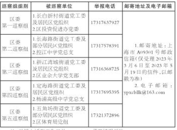 按照中共上海市杨浦区委的统一部署,区委五个巡察组将于2023年3月6日至2023年5月19日对区体育局党组、区投资促进办党委、定海路街道党工委及居民区党组织、长白新村街道党工委及居民区党组织、五角场街道党工委及部分居民区党组织、长海路街道党工委及部分居民区党组织、新江湾城街道党工委及居民区党组织、区业余大学党支部、控江中学党总支、杨浦高级中学党总支10个单位开展常规巡察。
