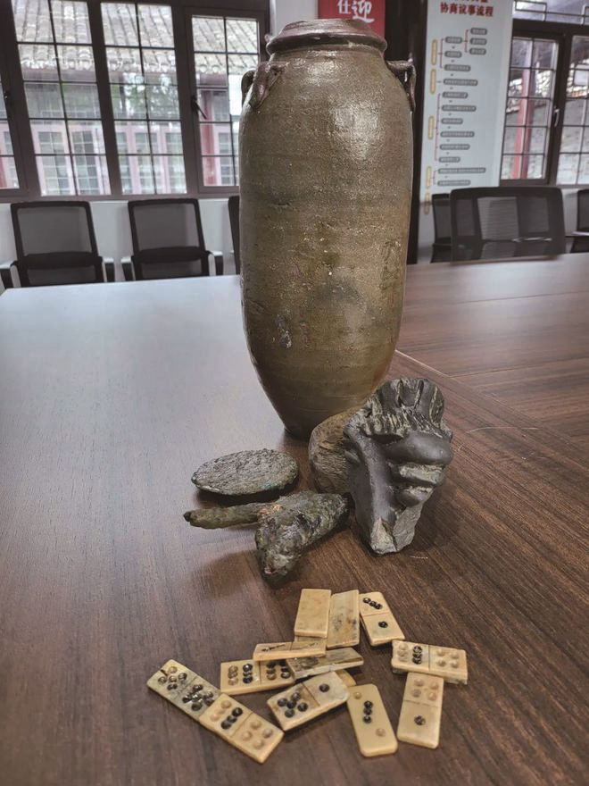 不过,甬道、谯楼旧址附近还有两口古井。北侧为一口唐井,内径约0.7米,深约3米,井砖为弧形灰砖,长、宽、厚分别约25、12、3厘米。唐井周边出土唐宋瓷片多个。西侧为宋井,距地表约1.3米,内径0.8米,井深约6.5米。井边井里出土21张宋代宣和牌(当时的麻将)、6个宋代韩瓶(军队装水的瓶子)及宋明清三代瓷片多个。嘉靖本《如皋县志》载:“十井在城中,嘉靖六年县尹梁乔升凿。县治左右二,旧儒学左右二……今俱湮塞。”梁乔升,字以顺,广东顺德人。明代正德十五年(1520)进士,曾任刑部主事,著有《平斋集》。嘉庆本《如皋县志·卷三·建置志》又记,明天启三年(1623),知县李衷纯重修县衙樵门:“凿双井于门之左右,以便居民之汲,慎郁攸之防。”李衷纯(1564—1639),字广霞,号元白、玄白,浙江秀水人,先后任如皋知县、扬州运使、两淮盐运使等职。