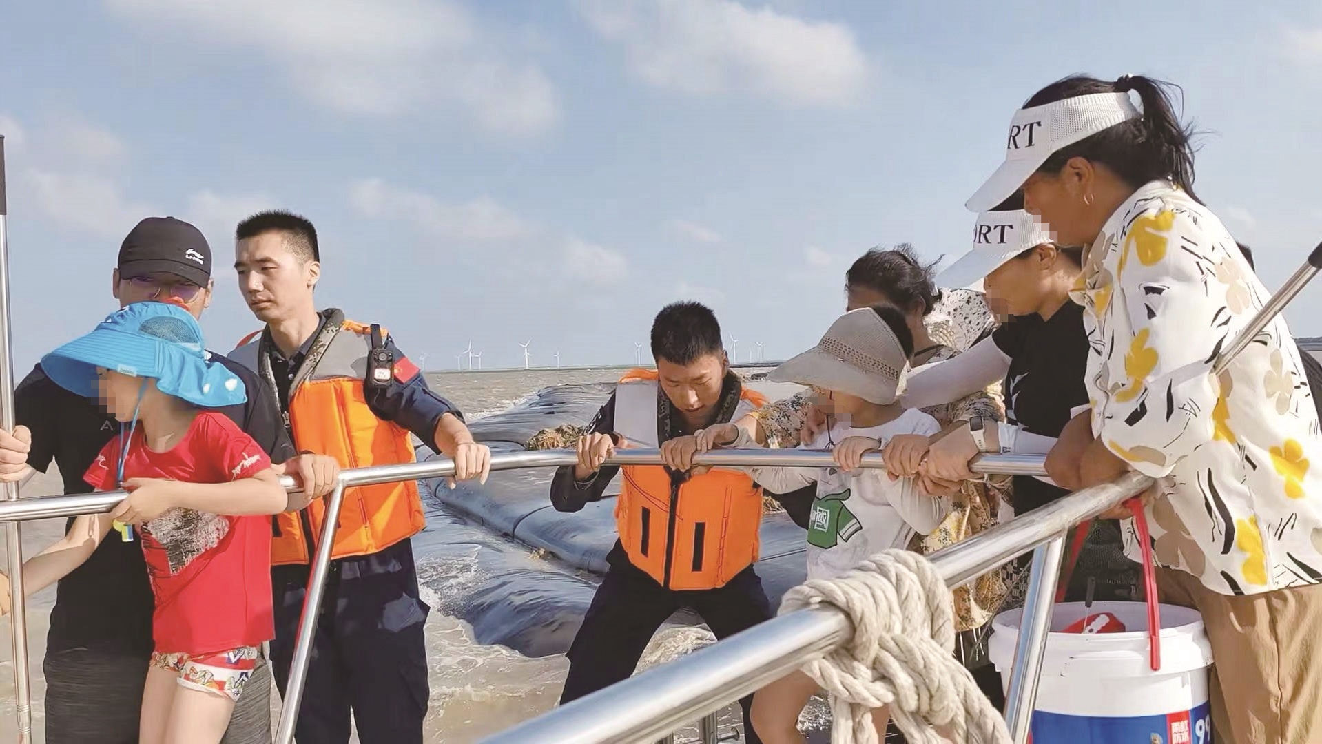 25日,南通海警局海安工作站民警救援游客上岸。当天下午3点多,在海安老坝港北侧海域一浅滩上,有11名游客因涨潮被困,请求救援。接警后,海安工作站立即指派正在海上巡逻的执法艇前往现场开展救援。 彭军君 符佳莹 陈再兴图文