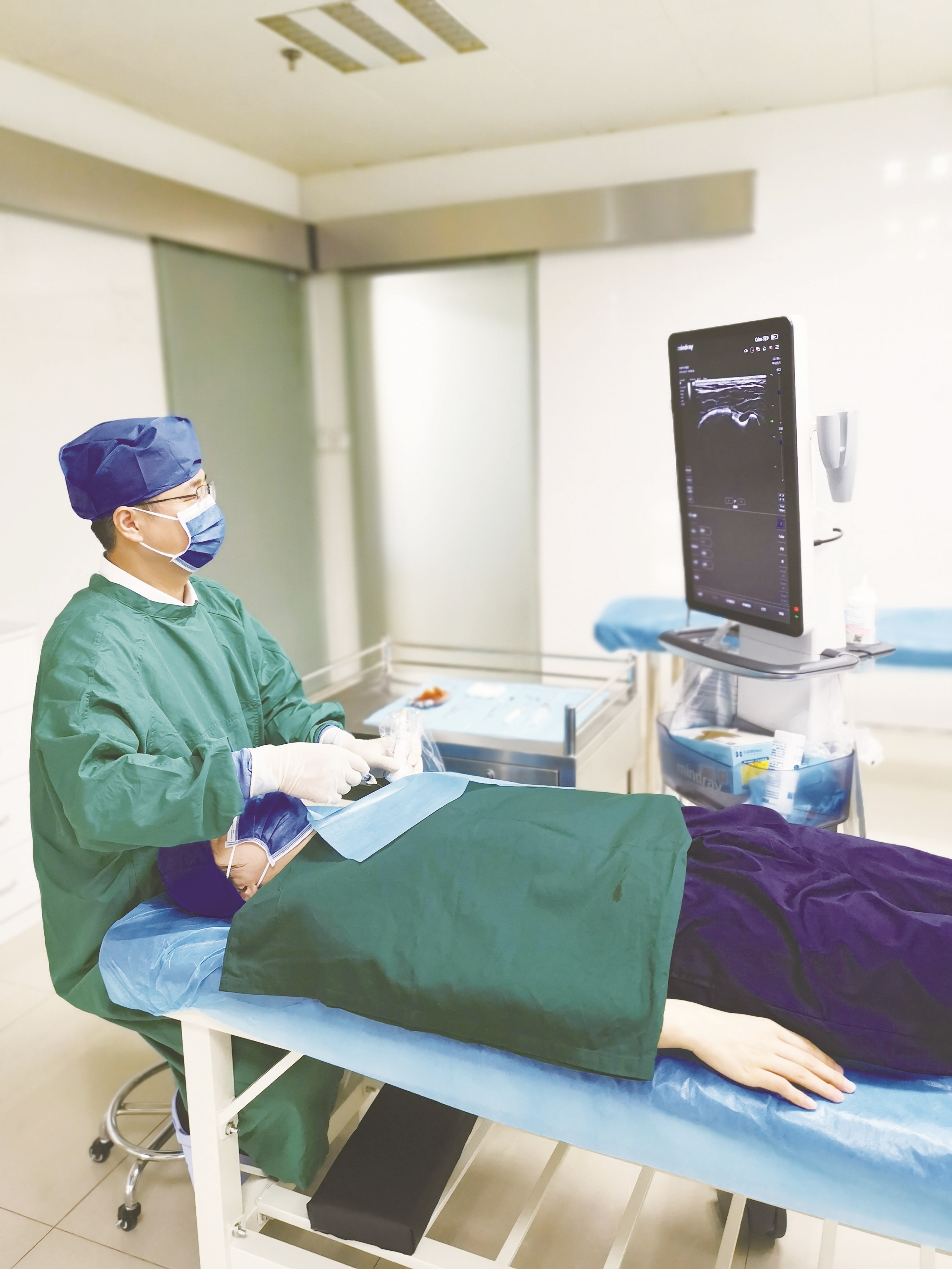 “经过核磁共振检查,我们发现,这是由肩袖损伤引起的肩关节冻结,属于超声介入治疗的适应证。”为此,管海涛在超声引导下,首先将灭菌注射用水打入瑶瑶的关节腔中,促进关节打开;再用高渗葡萄糖注射到肩袖损伤部位,进行“增生治疗”——刺激诱发无菌性炎症,从而让肩袖损伤部位启动再次修复,促进愈合;在此基础上,将臭氧注射到局部肩关节间隙,消除炎症;针对瑶瑶局部肌肉萎缩的症状,指导她通过练习“钟摆运动”,前屈、外展肌肉康复训练等,全面改善症状。“前后6次治疗,全程做到了绿色、安全、精准,没有使用任何激素药物,最终达到了根治效果。”令管海涛开心的是,由于疗效显著,瑶瑶很快重返泳池,并在第三届全国游泳城市系列赛(张家港站)青少年组中获一等奖。
