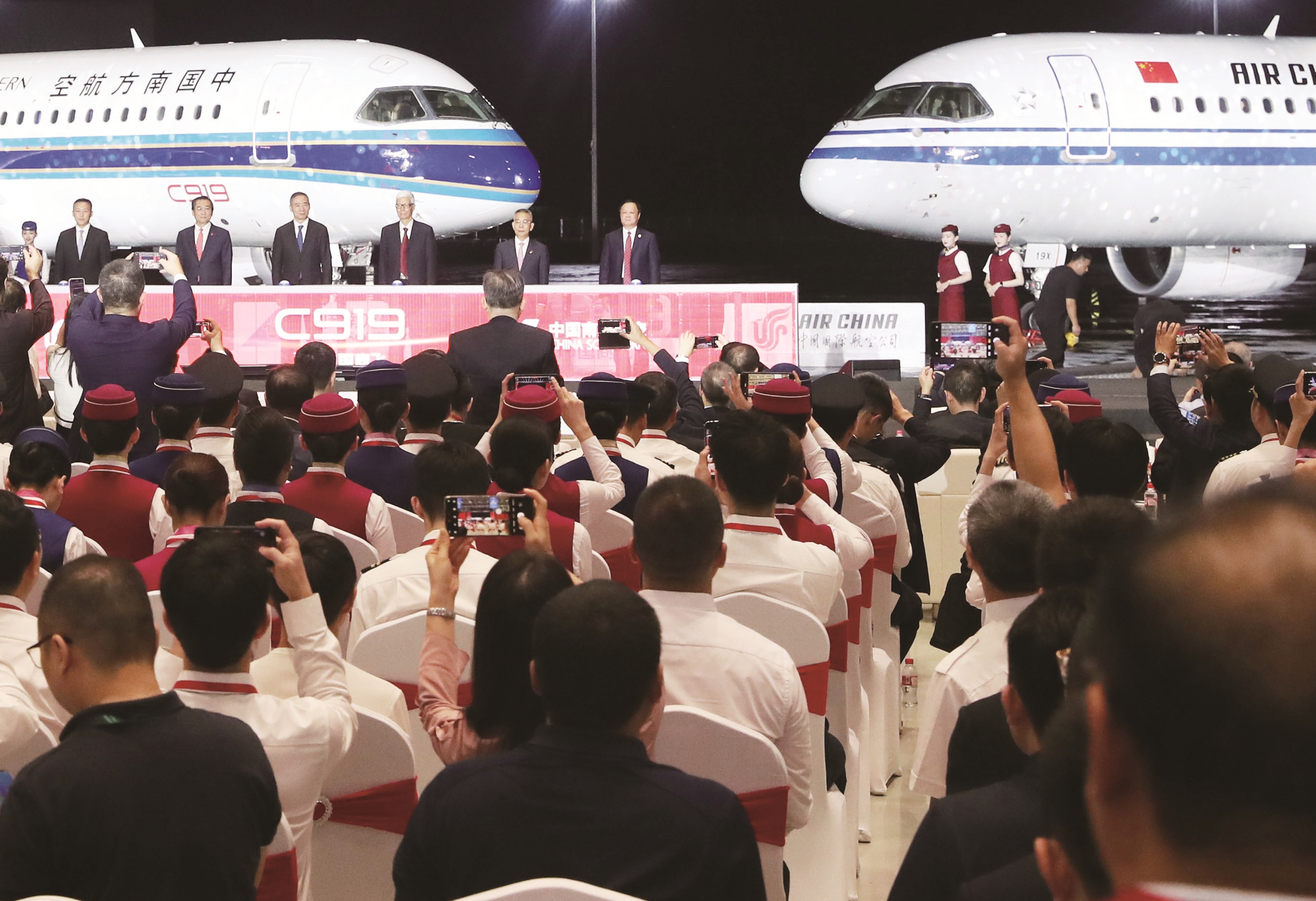 28日在中国商飞总装制造中心浦东基地拍摄的国产大飞机C919交付仪式现场。当日,中国国际航空公司和中国南方航空公司在中国商飞总装制造中心浦东基地同时接收首架C919飞机。这标志着C919飞机即将开启多用户运营新阶段。 新华社照片