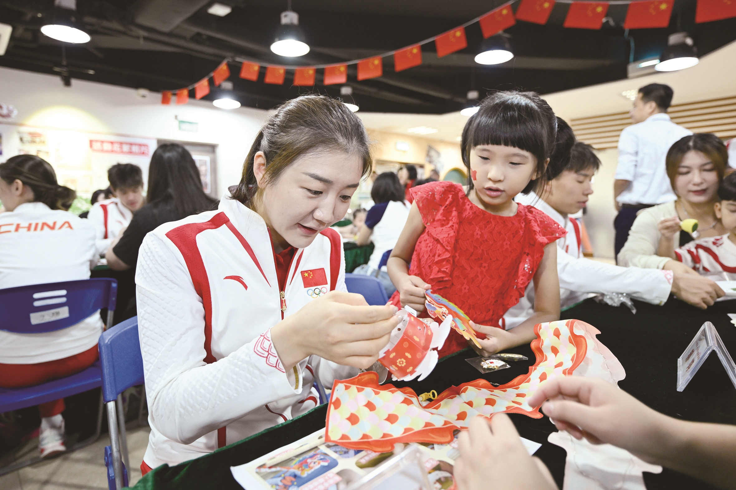 9月2日,在澳门工联氹仔湖畔综合服务中心,乒乓球运动员陈梦(左)与小朋友一起制作灯笼。当日,内地奥运健儿代表团走进澳门社区,分别到妇联乐满家庭服务中心、街总石排湾家庭及社区综合服务中心和工联氹仔湖畔综合服务中心与市民互动。新华社照片