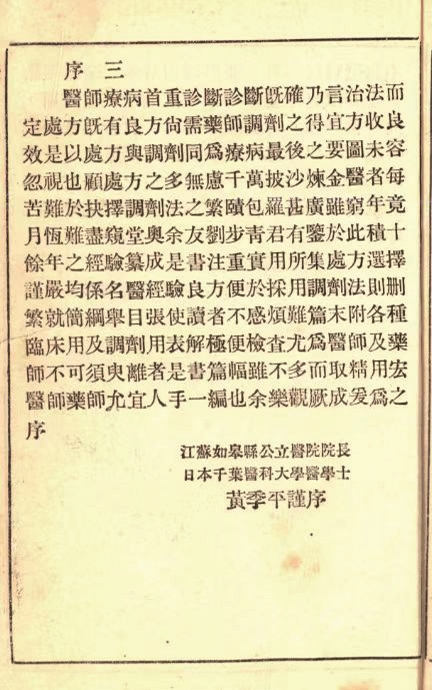 在如皋县任县公立医院院长时,黄季平已经很有名望。1930年9月,刘步青先生所著《实用调剂及处方》于上海发行。他恳请好友名流题字作序,其中作序者就有黄先生。黄季平传世文章甚少,此序又短,抄录如下: