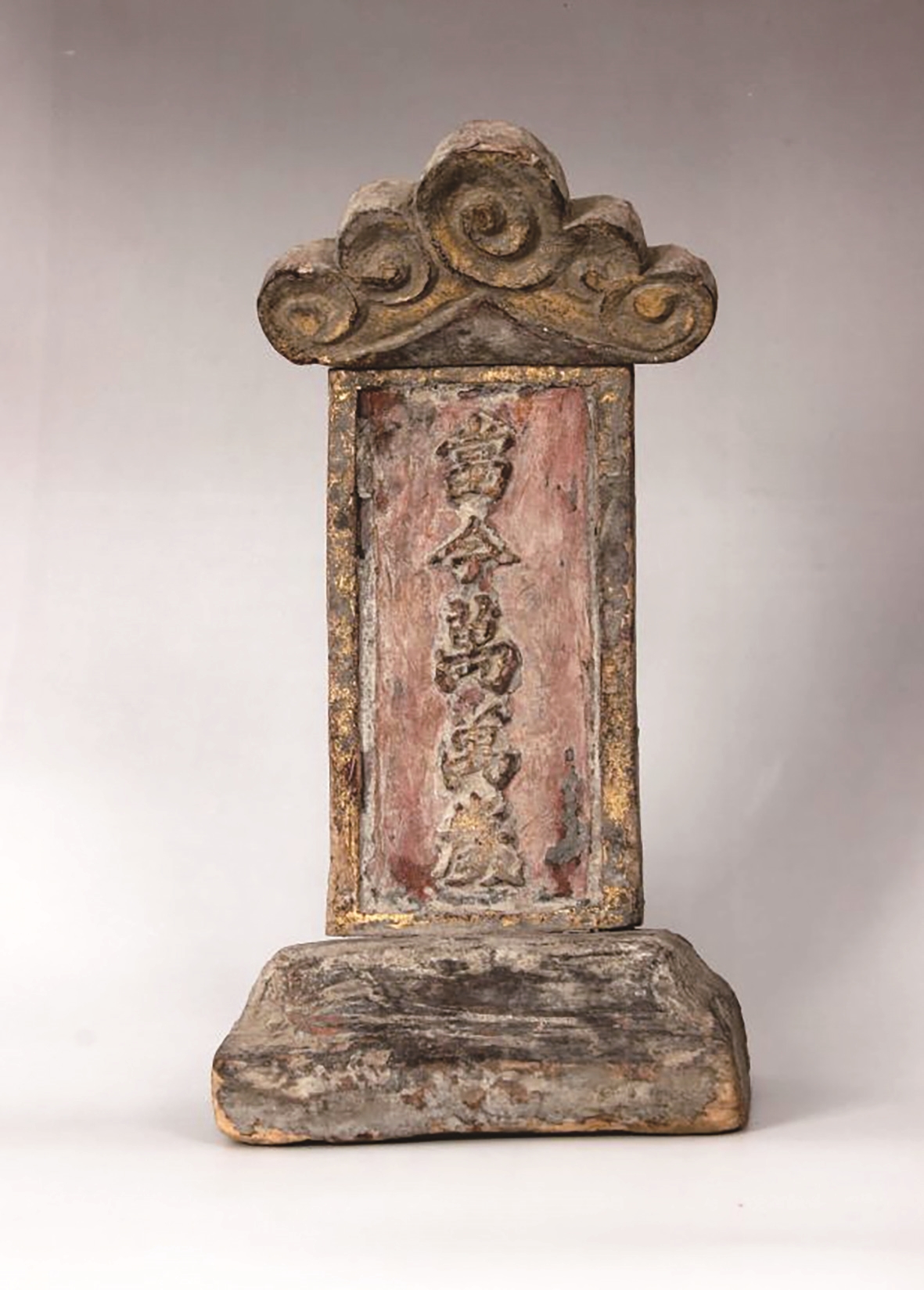 笔者大姑丈的父亲曾是上真观道士,我曾听姑丈说上真观“道经师宝”铜印和龙牌在中华人民共和国成立后为其父亲保存,龙牌其实有两块,一块写“当今皇帝万万岁”,另一块写“当今万万岁”。姑丈父亲20世纪60年代羽化后,铜印和龙牌归其二子保管,改革开放后其师弟将铜印和龙牌索要去,后来就不知道踪迹。近日笔者在一户头发现一块写有“当今万万岁”的牌位,不由联想起上真观龙牌,经联系,确认是小时候家中保存的上真观龙牌。龙牌为松木质,高27.5厘米,宽13厘米,厚9厘米,整体有云头、牌身和底座三部分,可以拆卸,周身披麻挂灰,髹红漆刷金,正面书楷书“当今万万岁”,历经岁月已经斑驳(见左图)。专家认定为明代物件,目前已入藏如东博物馆。