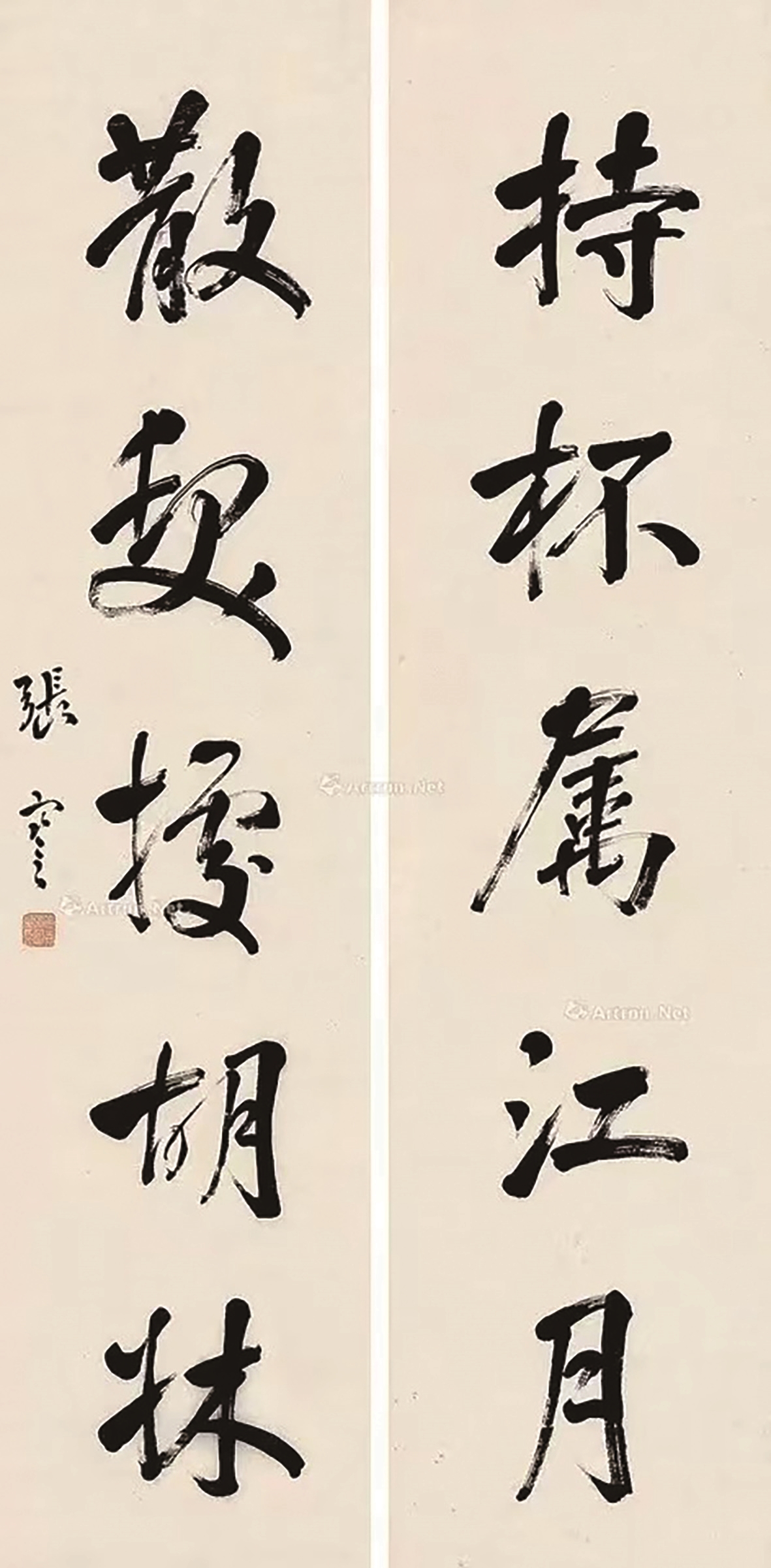 “持杯属江月,散发据胡床。”款识只有姓名与印章,写于何时,已难考证。上联“持杯属江月”,属,通“嘱”,与前一联相同,讲的也如“举杯邀明月”。下联“散发据胡床”, “散发”与“束发”相对,头发自由散开,表示自由自在的舒服状态。孟浩然(689-740)的《夏日南亭怀辛大》:“ 山光忽西落,池月渐东上。散发乘夕凉,开轩卧闲敞。”李白有诗曰“抽刀断水水更流,举杯消愁愁更愁。人生在世不称意,明朝散发弄扁舟。” 胡床自外国来,东汉时名“胡床”,隋改名“交床”,唐穆宗时又名“绳床”。其形制为:床足斜向交叉,上施床面,称之“交床”,有人认为大致类似带靠背的大马扎。此联不是张謇原创,而是出自宋代陆游的《追凉小酌》:“绿树暗鱼梁,临流追晚凉。持杯属江月,散发据胡床。苦荬腌齑美,菖蒲渍蜜香。醉来呼稚子,扶我上南塘。” 张謇书此联,不排除这是赏月饮酒时,兴之所至留下的。